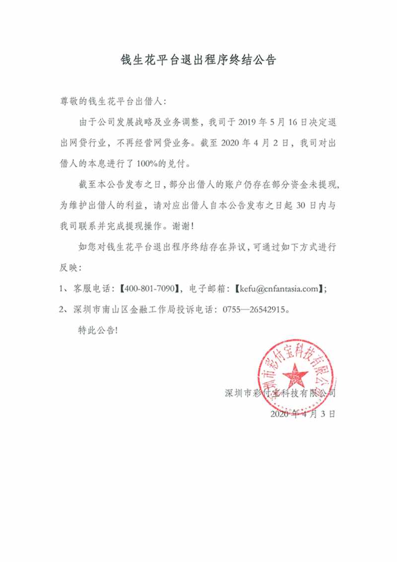 钱生花平台退出程序终结公告