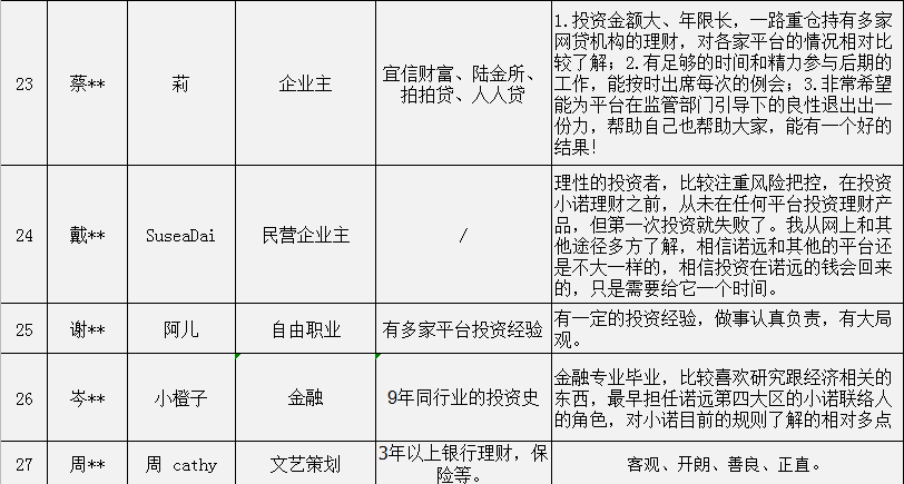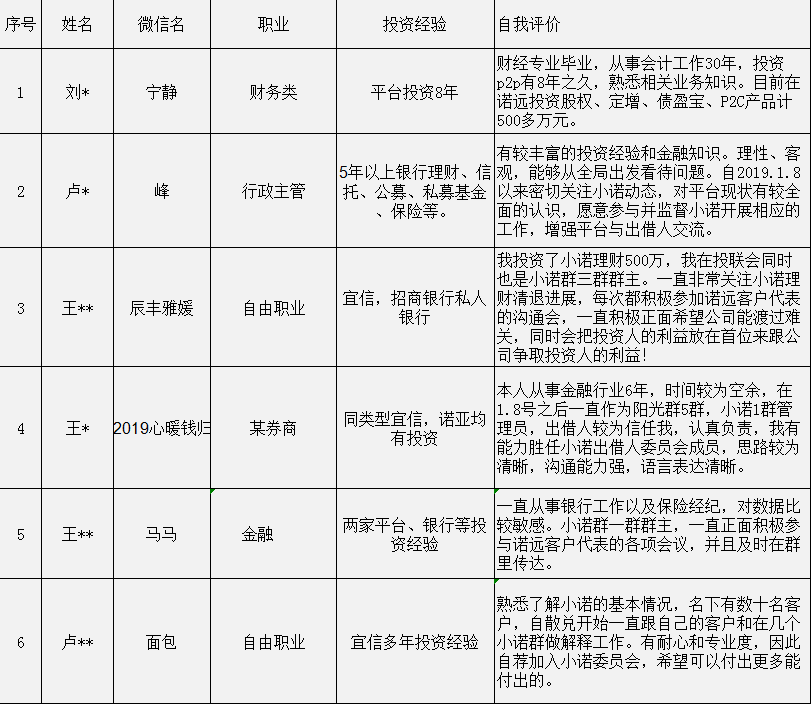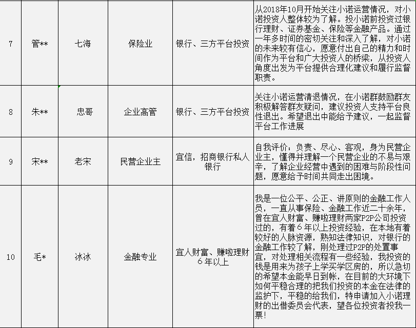 出借委投票今日已正式开始,请已授权客户至小诺官微后台回复“投票”两字,扫描弹出的二维码登录小程序进行投票。截止自荐结束日,共计有27位自荐的出借人参与竞选,我们将投票选出19位成为出借人代表。正式出借委成立后还由其中三位加入小诺工作组参与后续工作的探讨和决策。因为每人仅有一票,请选出您最认可的一位进行投选。
