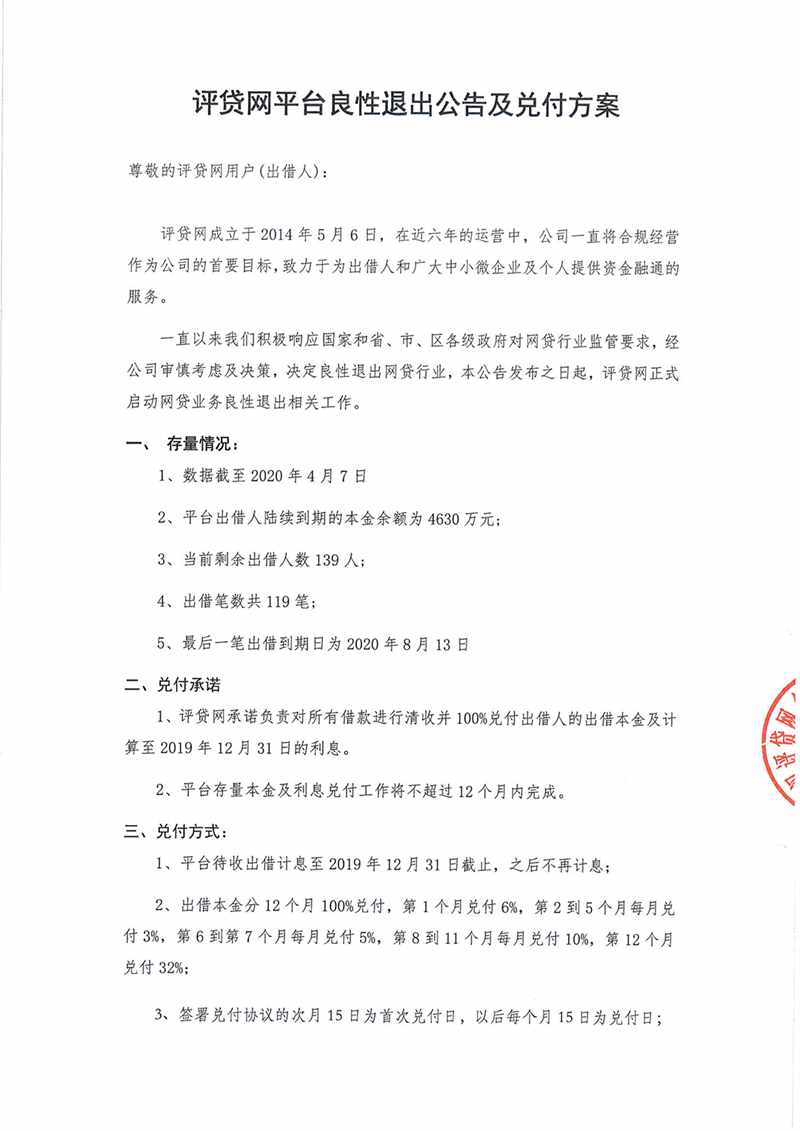 评贷网(国佳财富) 2020.4.17……评贷网平台良性退出公告及兑付方案