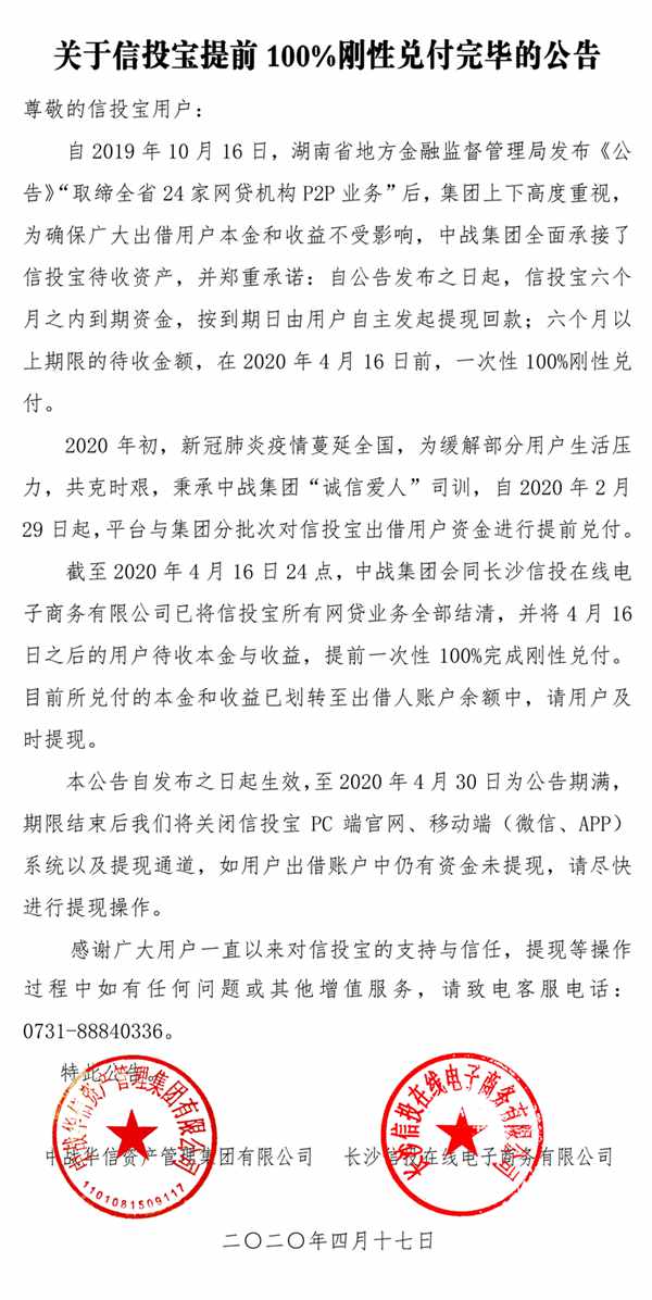 信投宝 2020.4.17-9:19……关于信投宝提前100%刚性兑付完毕的公告。本公告自发布之日起生效,至2020年4月30日为公告期满,期限结束后我们将关闭信投宝