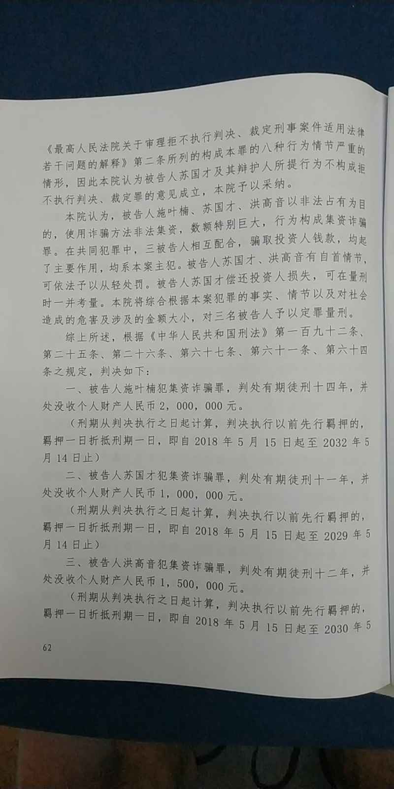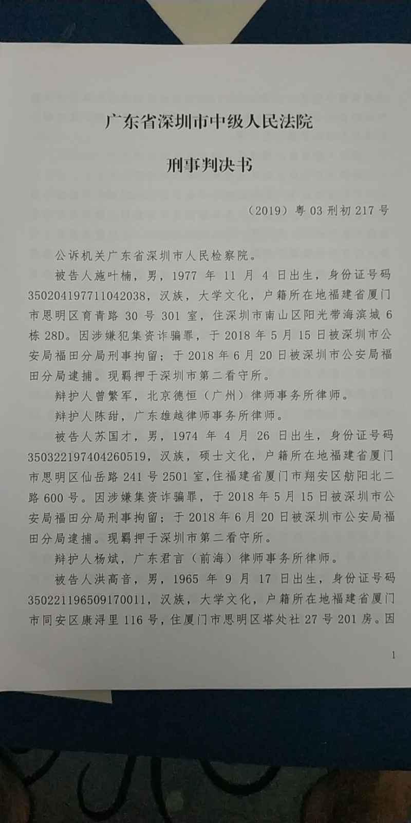 财大狮 2020.3.12……财大狮案刑事判决。被告人施叶楠犯集资诈骗罪,判处有期徒刑十四年,被告人苏国才犯集资诈骗罪,判处有期徒刑十一年,被告人洪高音犯集资诈骗罪,判处有期徒刑十二年