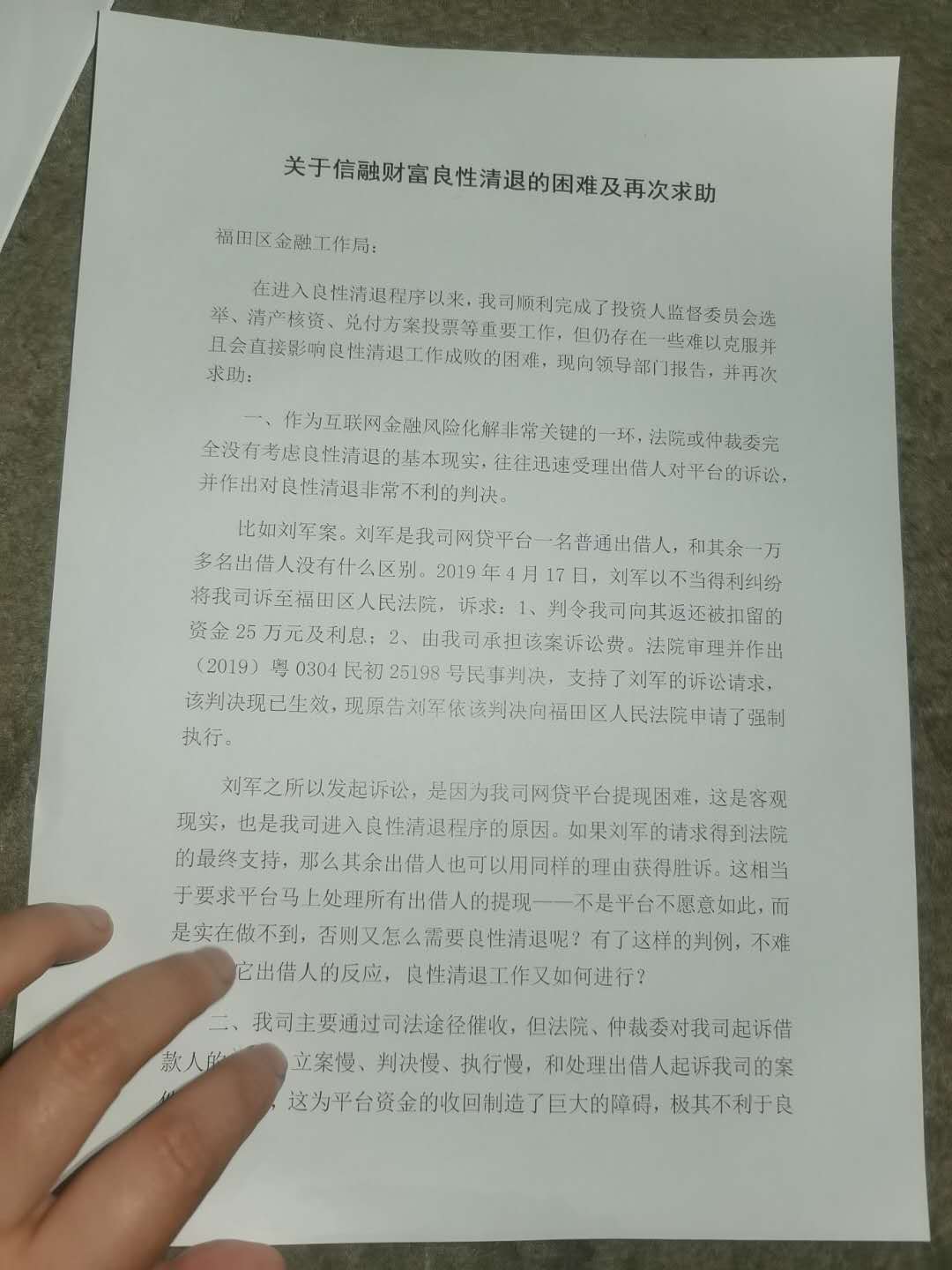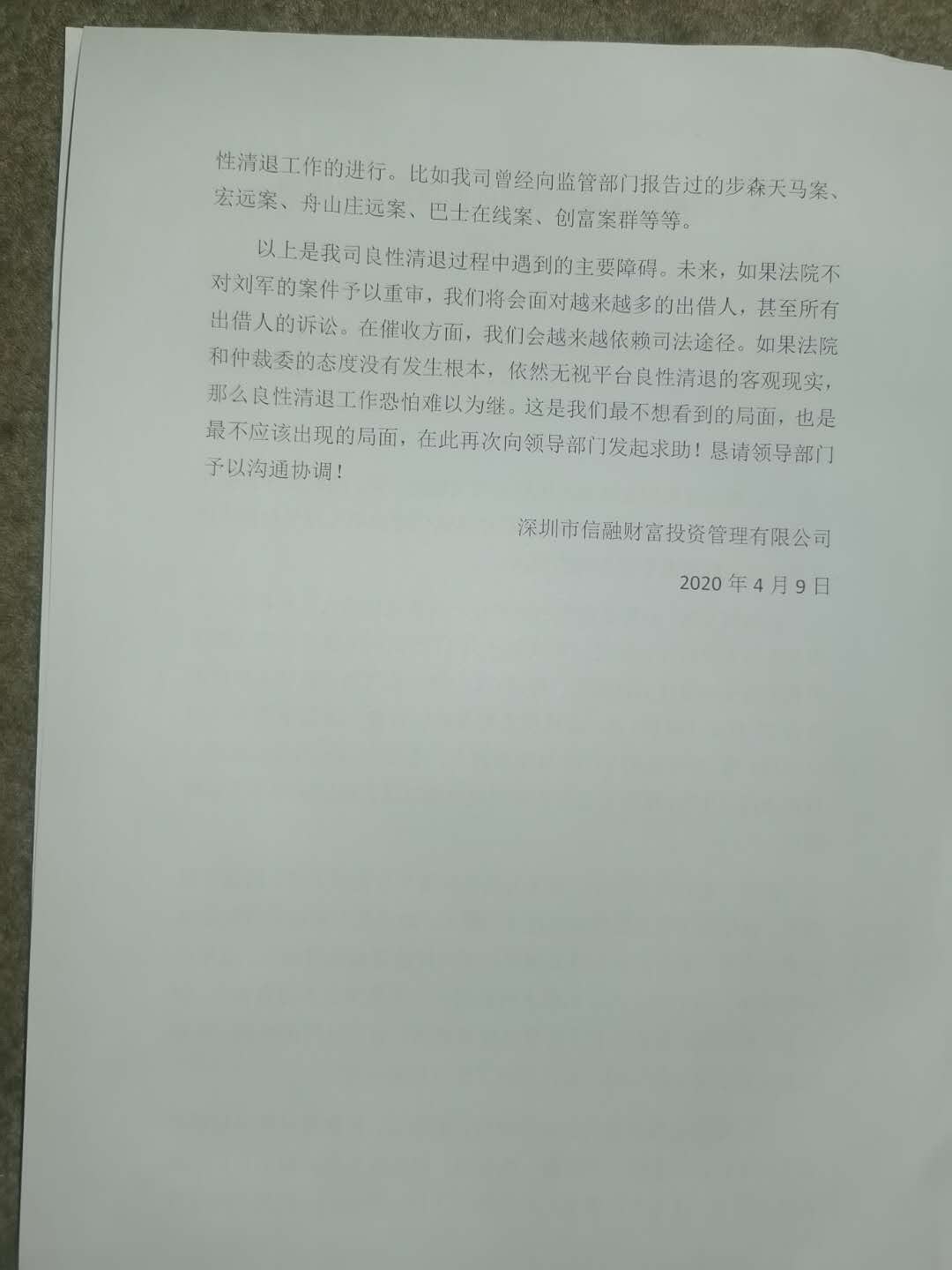 信融财富 2020.4.9……在进入良性清退程序以来,我司顺利完成了投资人监督委员会选举、清产核资、兑付方案投票等重要工作,但仍存在一些难以克服并且会直接影响良性清退工作成败的困难,现向领导部门报告,并再次求助:–、作为互联网金融风险化解非常关键的一环,法院或仲裁委完全没有考虑良性清退的基本现实,往往迅速受理出借人对平台的诉讼,并作出对良性清退非常不利的判决