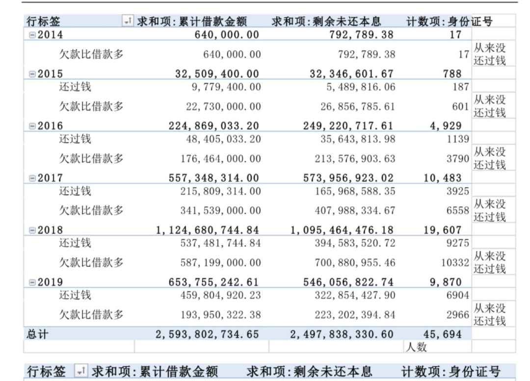 更有甚者,公开的逾期借款人中,有24264借款人从未还过钱,占公开逾期人数的53%,金额高达15.73亿元,占公开逾期金额的63%。这种从不还钱的人,谈什么还款意愿?当初和信贷又是怎么给这些人放的款?