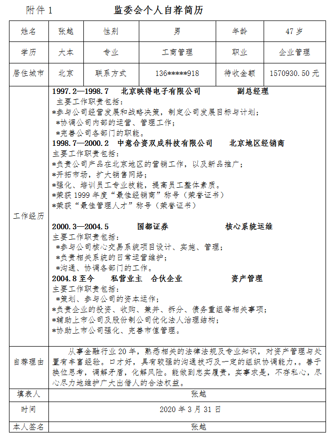 1、具有丰富的资产清理与拍卖经验,擅长处理各类财务报表。2、具有群体性权益事件处理经验,擅长组织、沟通与协调。3、住所相近且时间充裕,便利参与良性清退工作。4、做事认真,执行力强,主张清退过程中“铁腕催收”。