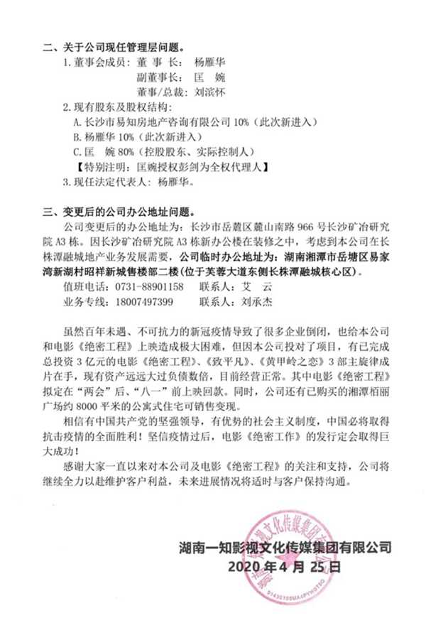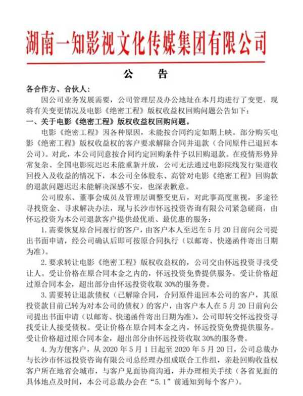 一知影视文化传媒 2020.4.25-23:32……重要公告!!!各合作方、合伙人:因公司业务发展需要,公司管理层及办公地址在本月均进行了变更。现将有关变更情况及电影《绝密工程》版权收益权回购问题公告如下:……公司无法通过电影院线发行渠道收回投入及收益,本公司全体股东、高管对电影《绝密工程》回购款的退款问题迟迟未能解决深感不安……要求转让电影《绝密工程》版权收益权的,公司交由怀远投资寻找受让人。受让价格在原合同本金之内的,怀远投资免费提供服务,受让价格超过原合同本金,超出部分由怀远投资收取30%的服务费