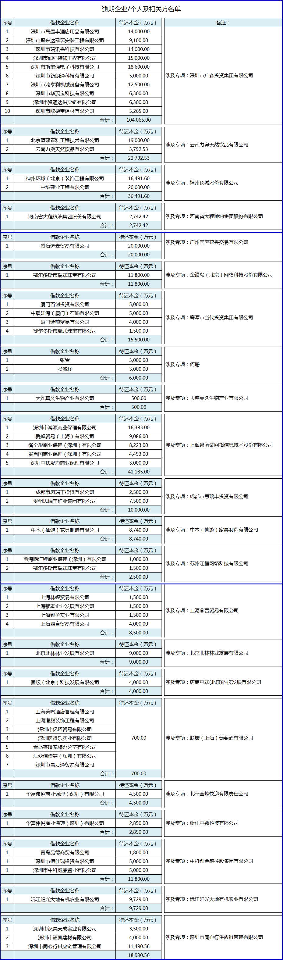 在临时危机管理工作组的带领下,催收工作组通过多种方式持续对逾期借款企业展开催收,对有积极还款意愿的企业就其兑付计划进行了多轮次谈判交流。其中,一部分企业的兑付计划进入落地执行阶段,一部分企业已开始着手制定兑付方案;但仍有一部分借款企业,在多次电话、微信、邮件沟通后,在工作组发送律师函责令其还款以及多次前往现场催收后,仍然拒不履行还款义务,甚至个别企业出现常态化失联现象。为此,本着对广大投资人/出借人负责的态度,经临时危机管理工作组研究决定,现公布2020年度第一期重点逾期企业及个人名单: