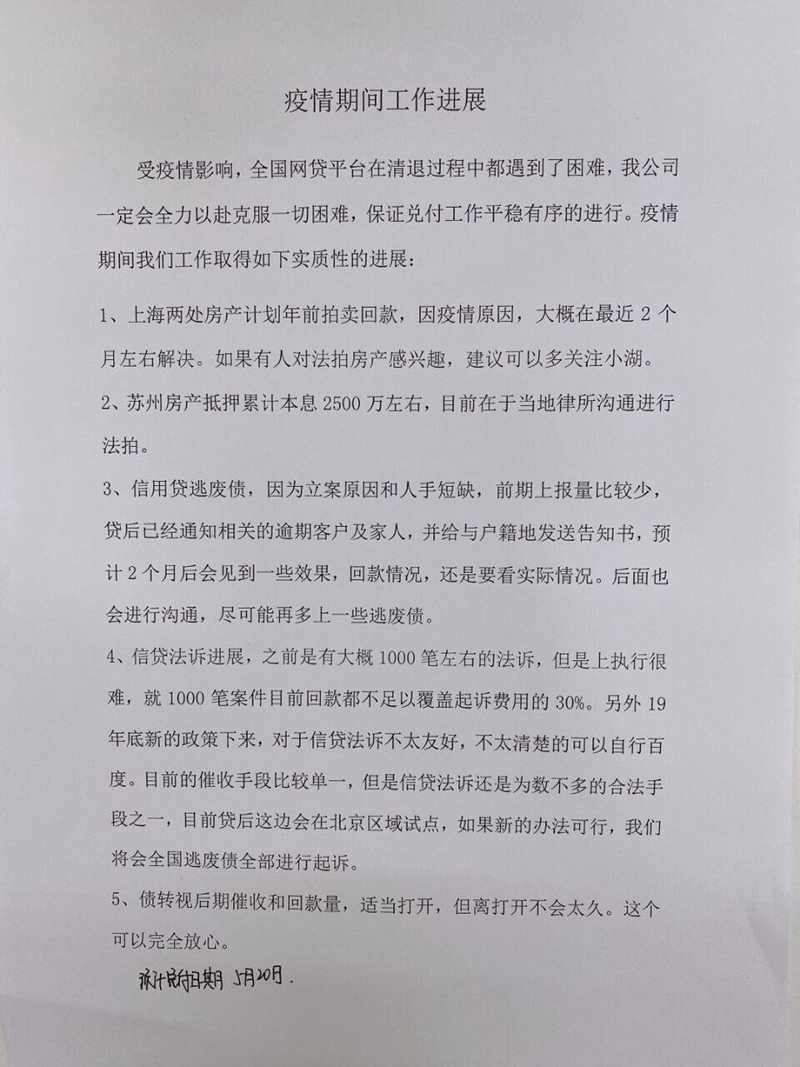 受疫情影响,全国网贷平台在清退过程中都遇到了困难,我公司一定会全力以赴克服一切困难,保证兑付工作平稳有序的进行。疫情期间我们工作取得如下实质性的进展: