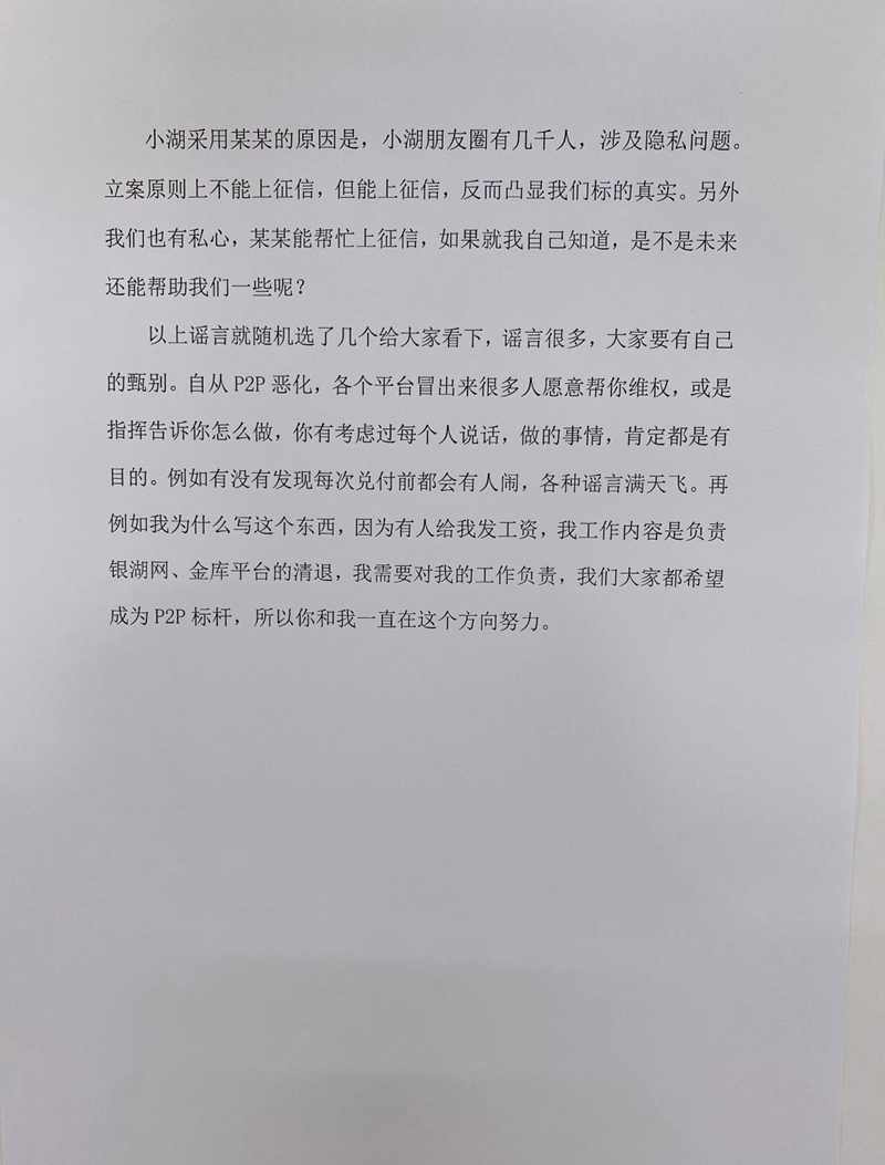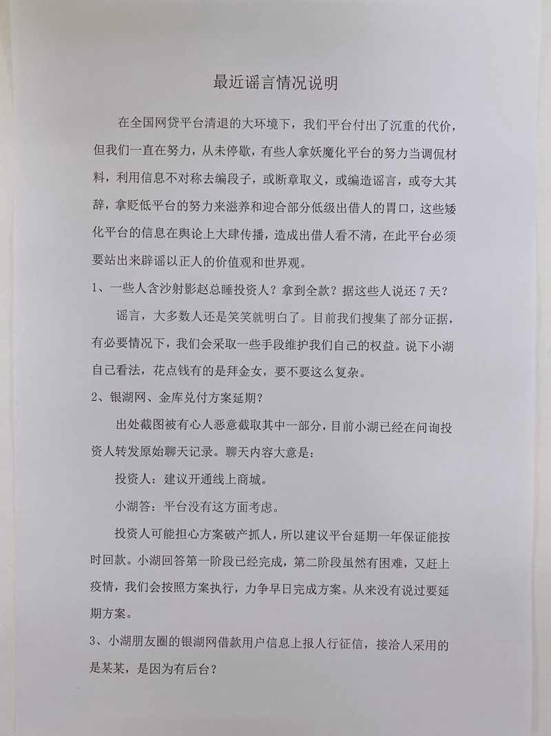 银湖网、熊猫金库 2020.5.12-15:38……最近谣言情况说明……有些人拿妖魔化平台的努力当调侃材料,利用信息不对称去编段子,或断章取义,或编造谣言,或夸大其辞……一些人含沙射影赵总睡投资人?拿到全款?据这些人说还7天
