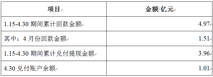 1、截至2020年4月30日,回款与兑付账户余额数据