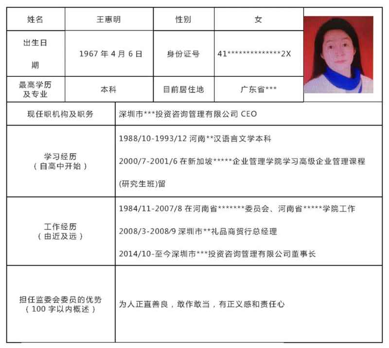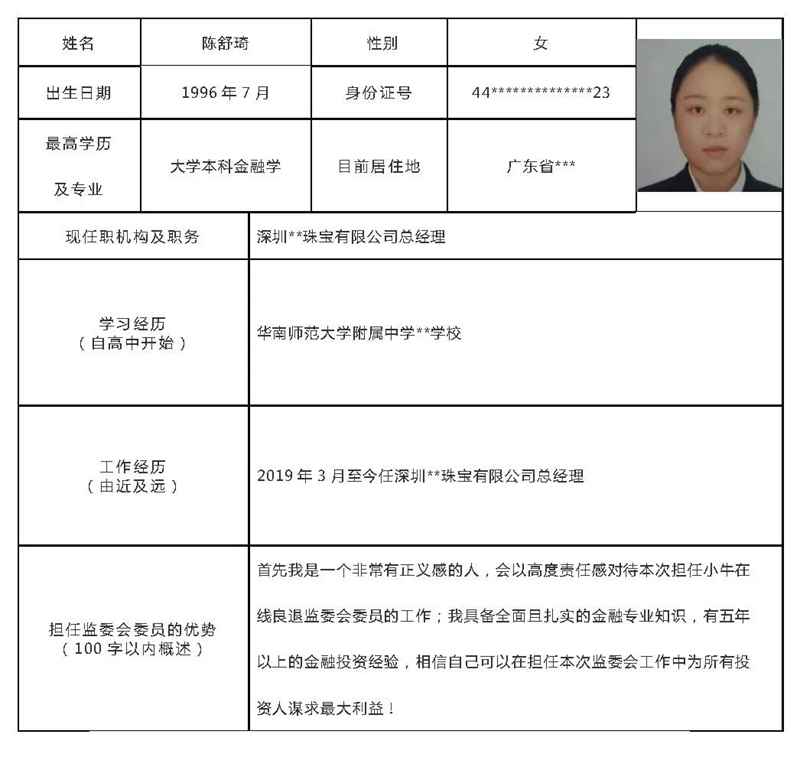 为了让大家选举出具有代表性、负责且有担当的监委会成员,切实维护广大出借人的利益,从本周二至本周四,小编将每日为各位出借人展示10名监委会候选人简历,简历是根据候选人个人意愿,对部分照片及隐私信息进行了隐私处理。