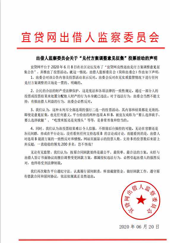 出借人监察委员会关于“兑付方案调整意见征集”投票活动的声明