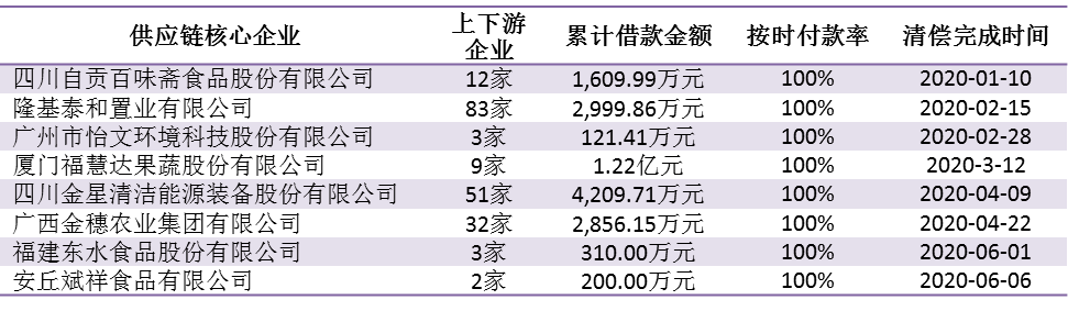 新冠肺炎疫情期间,平台坚持“三降”要求,经平台协商努力已有8家核心企业及其195家供应链上下游企业完成向出借人清偿全部借款,企业按时付款率均为100%,披露如下: