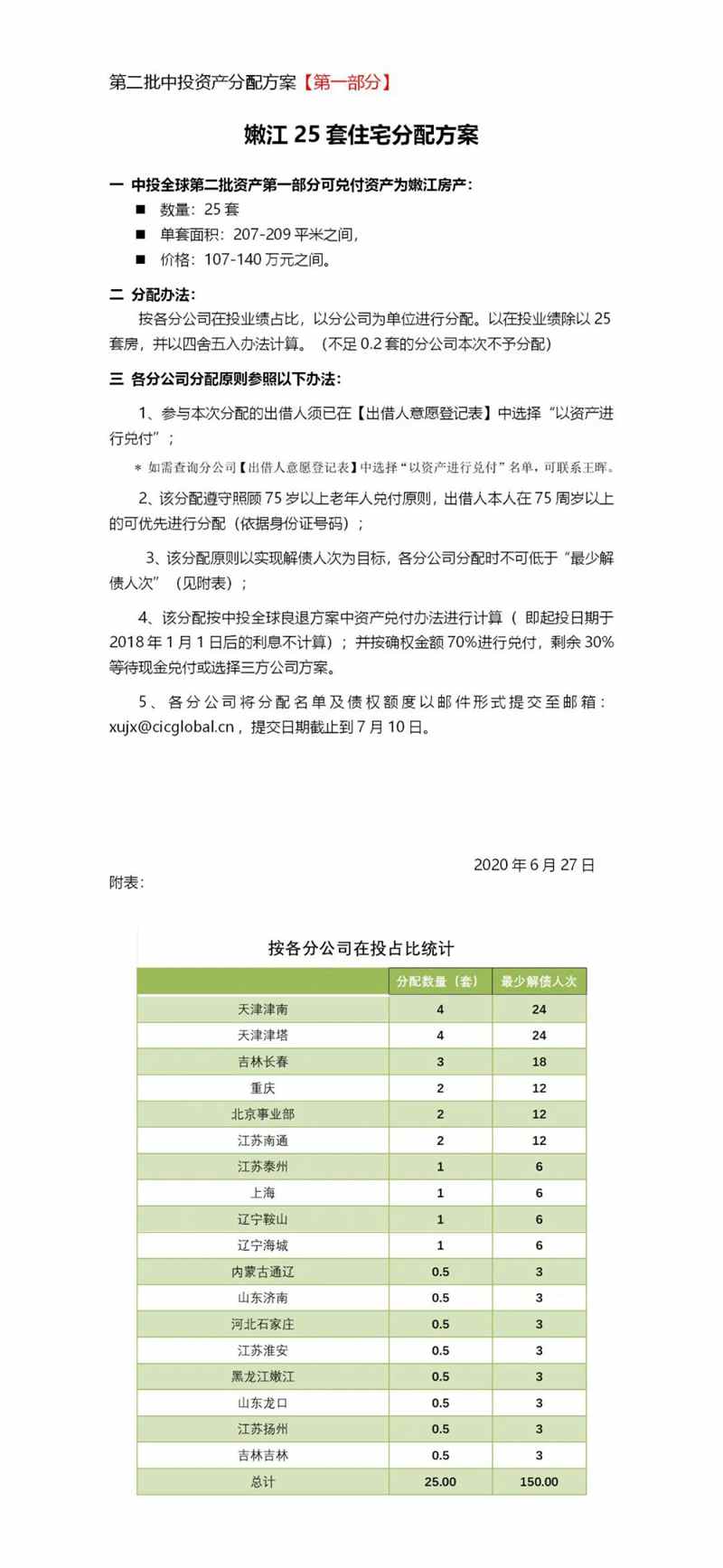 中投全球 2020.6.28……第二批中投资产分配方案【第一部分】嫩江25套住宅分配方案。按各分公司在投业绩占比,以分公司为单位进行分配。以在投业绩除以25套房