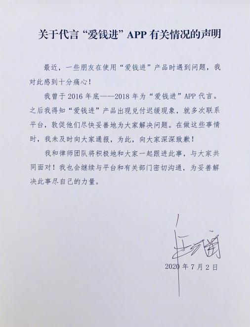 我曾于2016年底——2018年为“爱钱进”APP代言。之后我得知“爱钱进”产品出现兑付迟缓现象,就多次联系平台,敦促他们尽快妥善地为大家解决问题。在做这些事情时,我未及时向大家通报,为此,向大家深深致歉!