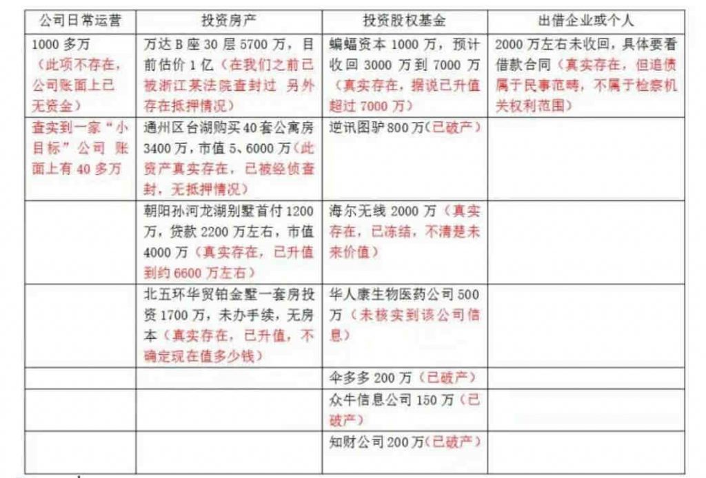 他说审计报告已经完成,但是它和将来的返还数额没有关系,冻结和查封的财产才和返还有关,这点在和我们的代表和他面谈时他已经说的很清楚。他举了例子,如果要返还100个亿,但冻结和查封的财产为零,意味着没有可以返还的。他还说法院阶段冻结和查封的高的财产与检察院阶段基本无变化,只多了几十万。