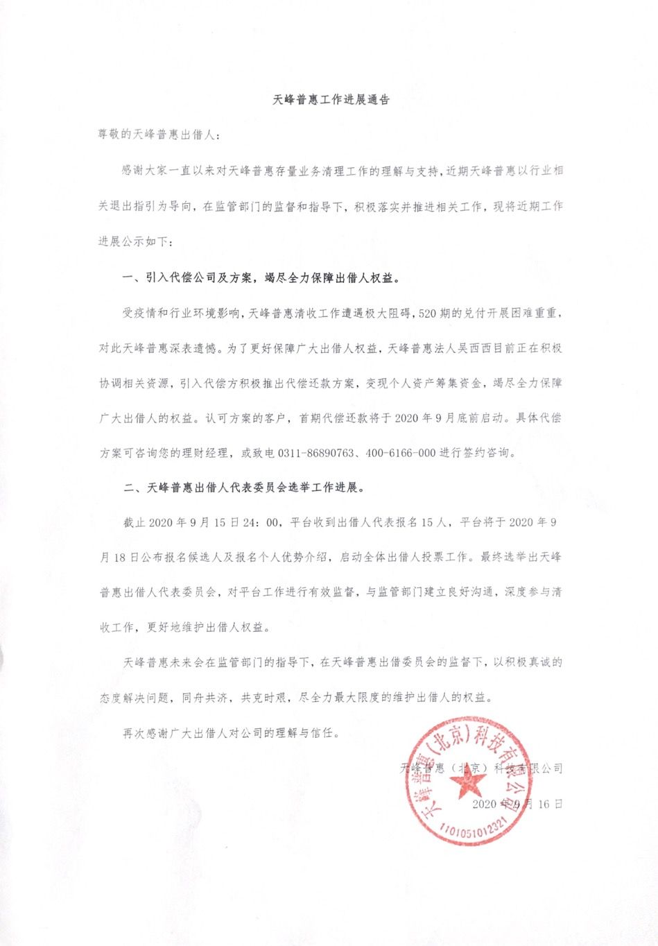 天峰普惠工作进展通告发布时间:2020-09-16