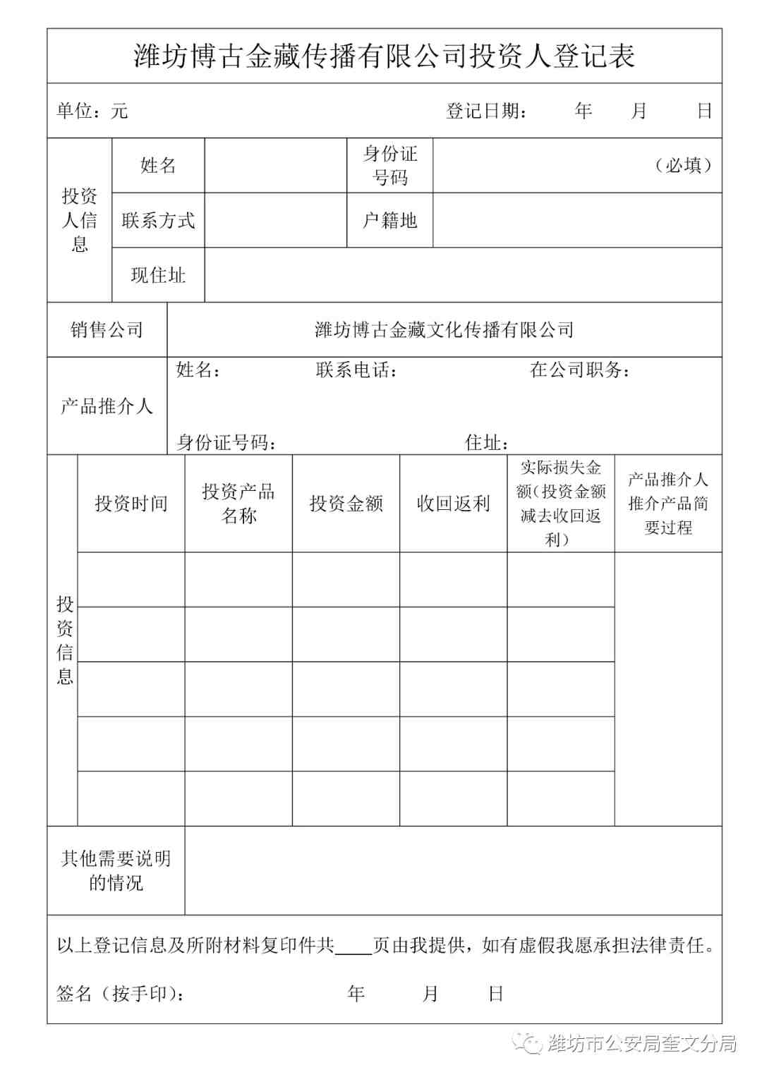 为维护投资人权益和保证案件侦查的顺利进行,以确实准确的犯罪数额追究相关犯罪嫌疑人刑事责任,现要求潍坊博古金藏文化传播有限公司所属投资人向公安机关提交相关资料,我局将依据投资人提供的资料进行犯罪数额认定,并依法进行司法审计,维护投资人相关权益。