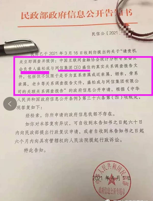 我部已于2021年3月16日收到你提出的关于“请贵机关立即调查并提供:中国互联网金融协会统计分析专业委员会负责人盛松成与网信集团CE0盛佳的真实关系调查报告文件,包括但不仅限于是否为直系亲属或近亲属,姻亲,旁系亲属,老乡等关系调查报告文件,盛松成与网信集团有限公司的关联关系调查报告”的政府信息公开申请。根据《中华人民共和国政府信息公开条例》第三十六条第(四)项规定,现答复如下: