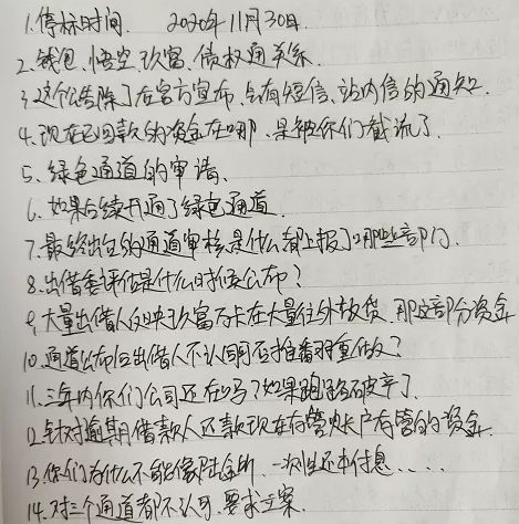 与此同时,守在国恒办公室的难友有了新的发现,他们在办公室发现了一个国恒员工的笔记本,里面记录了玖富设置的应对难友提出问题的部分话术,以及大量的预想问题。请看下图: