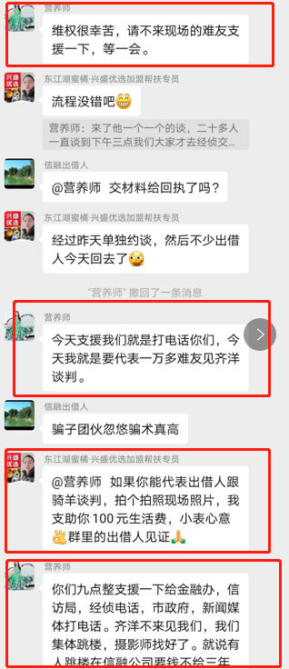 信融财富 2021.4.21……关于4月20日出借人到信融闹访的情况通报。4月20日早8点左右,胡某、王某、夏某三人进入信融所在办公大楼,未经许可打开露台,坐到露台花栏护墙上,高呼要面见信融法人齐洋先生,现场给钱,否则就跳楼。事件惊动福田公安分局、消防局、华富派出所及街道等有关部门,分局派出谈判专家现场开导劝解避免事件恶化,同时清退组安排齐洋先生到街道会议室接待,胡某于10点左右经劝到街道与齐洋先生见面沟通,王某、夏某依然不听劝,策略就是胡某与齐洋先生见面达不到其要求,另两人就继续。10:20齐洋先生和清退组卢震坤先生在街道、派出所等部门的协助下在街道会议室与胡某等四人面对面沟通(三人均为胡某在微信群直播跳楼叫来的,其中一人非出借人),对于出借人提出的问题,齐和卢均给予了正面答复。但胡某一再表示不给钱就不行的要求,卢震坤先生也给予了明确的答复,符合清退兑付方案,符合全体出借人利益的事情可以商量解决,对于胡某提出的本息全额兑付的要求坚决拒绝。因另二人一直以跳楼胁迫,至12:30后见面会结束,双方未达成任何处理意见。下午13:30,王某因身体不适送医院救治,15:00夏某劝离跳楼现场,带至派出所处理