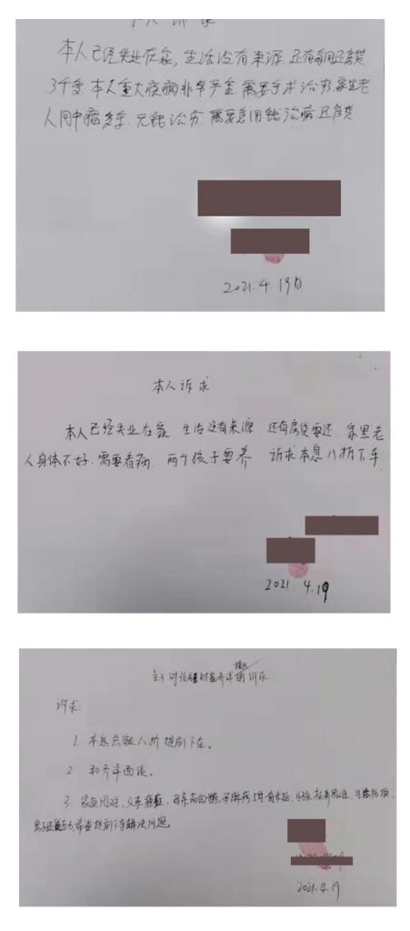 2021年4月19日清退组接待以胡某(微信名营养师)为首的十多位出借人来访,根据现场的接待和了解,大多数出借人来之前均有和清退工作组联系过,相关诉求已在处理中。此次来访主要是看群里有人说来现场就能拿到钱,所以跟来看看,顺便了解一下信融清退的进度和困难,了解情况后相继离开。据了解,离开后仍有部分出借人去福田经侦投诉,具体情况不清楚,根据转至清退组的文件,当天到经侦的有三名出借人书写了诉求并签名按指模,一名要求本息全额兑付,二名要求本息八折兑付,三名出借人情况分别为: