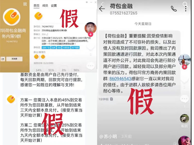 近期,本平台接到部分出借人反馈,有不法分子在抖音、QQ等社交平台假冒荷包金融官方平台,谎称只要垫付其本息的25%—45%即可在3—9天内全额本息兑付,向出借人进行虚假宣传及诈骗,造成出借人的财产损失。