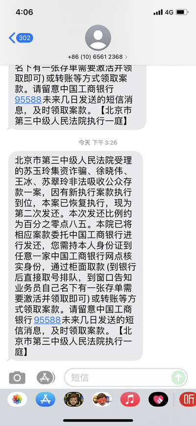 北京市第三中级人民法院受理的苏玉玲集资诈骗、徐晓伟、王冰、苏翠玲非法吸收公众存款一案,因有新执行案款执行到位,本案已恢复执行,现为第二次发还。本次发还比例约为百分之零点八五。本院已将相应案款委托中国工商银行进行发还,您需持本人身份证到任意一家中国工商银行网点核实身份,通过柜面取款(到银行后直接取号排队,到窗口告知业务员自己名下有一张存单需要激活并领取即可)或转账等方式领取案款。请留意中国工商银行95588未来几日发送的短信消息,及时领取案款。[北京市第三中级人民法院执行一庭]短信