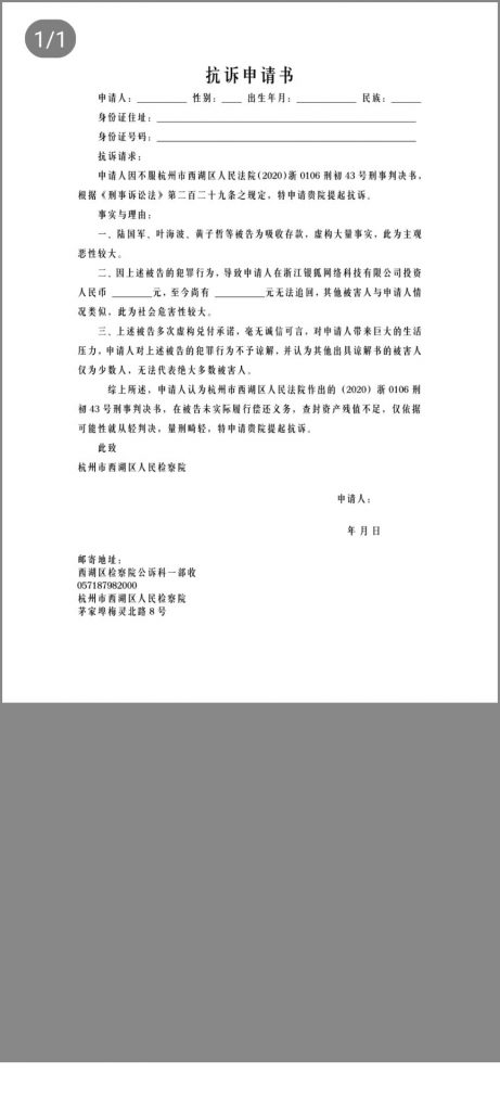 银狐财富出借人不服一审判决,纷纷邮寄抗诉书去检察院,要求对一审判决提起抗诉。抗诉成功的话,这样一来又是一年,出借人的命运是够悲惨的了。