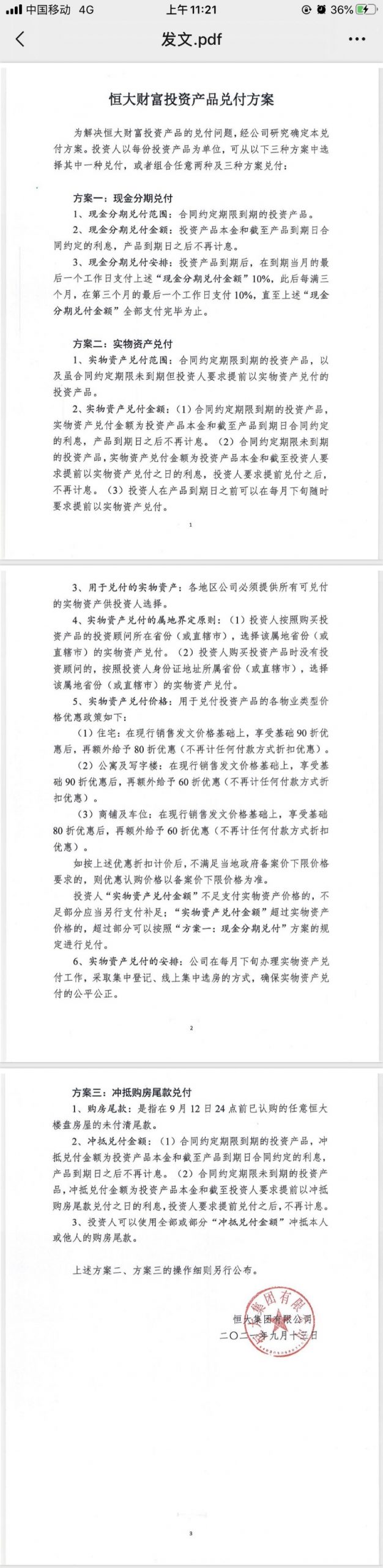 为解决恒大财富投资产品的兑付问题,经公司研究确定本兑付方案。投资人以每份投资产品为单位,可从以下三种方案中选择其中一种兑付,或者组合任意两种及三种方案兑付: