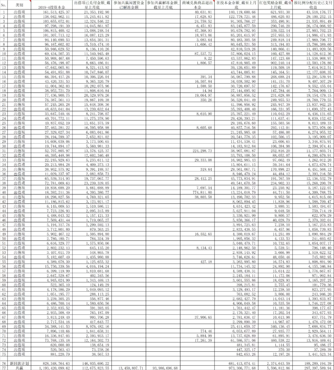 ◆  因为从平台角度,“按月统计”数据必须以2019.4.15时的在投出借人作为存量出借人来统计“累计收回的利息”、“红包”、“催收协商减免本金”、“第三方催收费用”等相关数据,所以汇总统计中无法加入因债转退出引起的相关数据的变化。