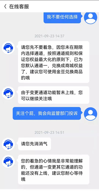 可玖富客服却说:请您先不要着急,因您未在期限内选择通道,按照通道规则和保证您权益最大化的原则下,已为您默认通道一,兑换成商城权益了,建议您可使用金豆兑换商品的哦。