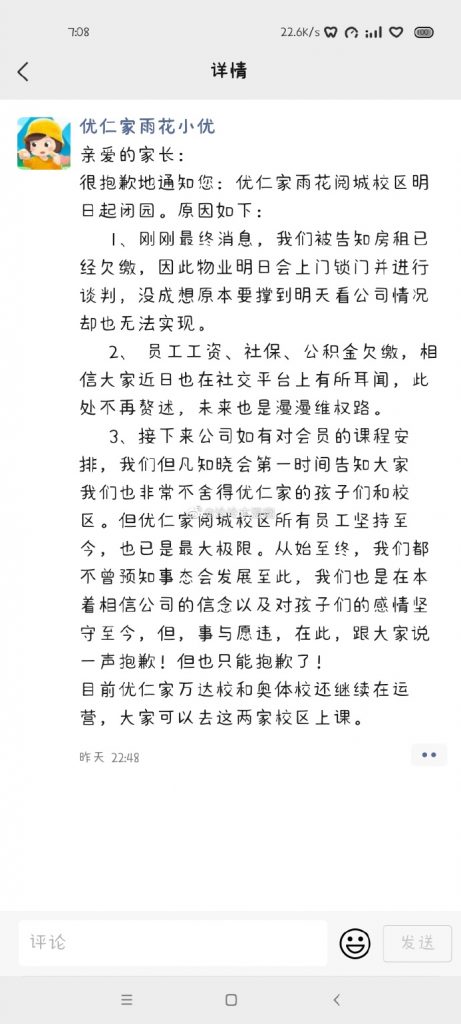 10月14日晚22:52, 优仁家雨花阅城校区老师在其微信朋友圈发布消息称:因房租、员工工资、社保等原因,优仁家雨花阅城校区自2021年10月15日起闭园。