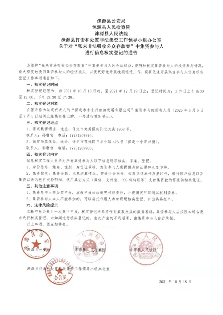 涞源县打击和处置非法集资工作领导小组办公室关于对“张来非法吸收公众存款案”中集资参与人进行信息核实登记的通告
