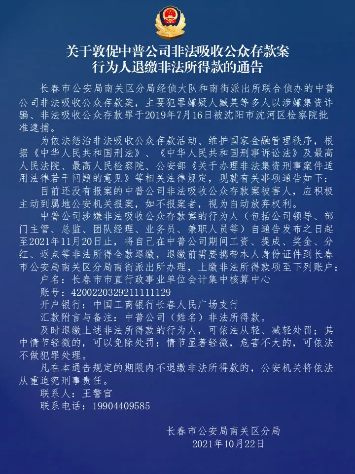 中普公司涉嫌非法吸收公众存款案的行为人(包括公司领导、部门主管、总监、团队经理、业务员、兼职人员等)自通告发布之日起至2021年11月20日止,将自己在中普公司期间工资、提成、奖金、分红、返点等非法所得全款退缴,退缴前需要携带本人身份证件到长春市公安局南关区分局南街派出所办理,上缴非法所得款项至下列账户: