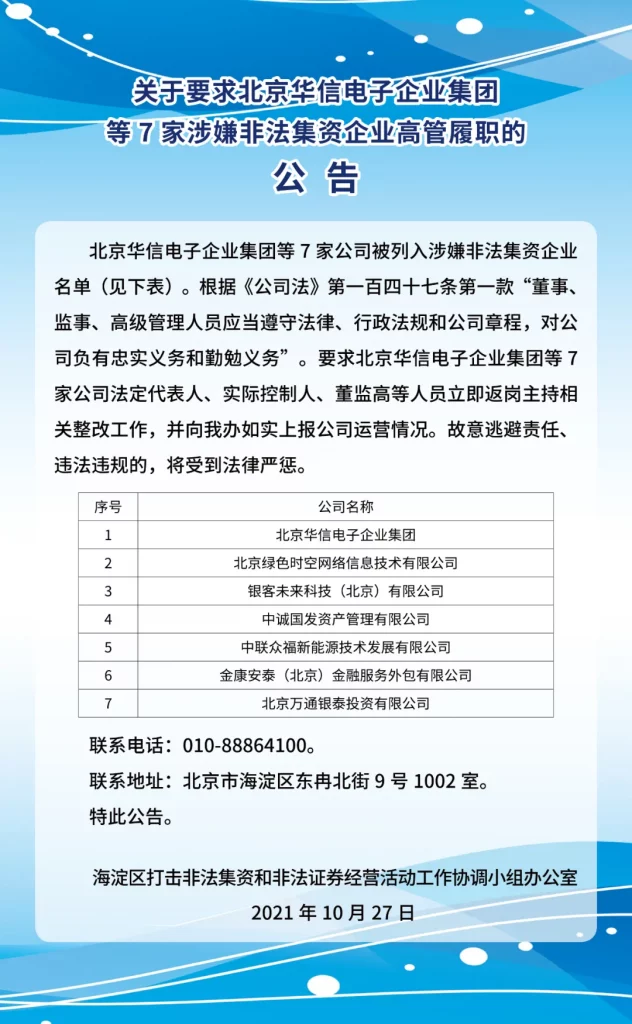 关于要求北京华信电子企业集团等7家涉嫌非法集资企业高管履职的公告