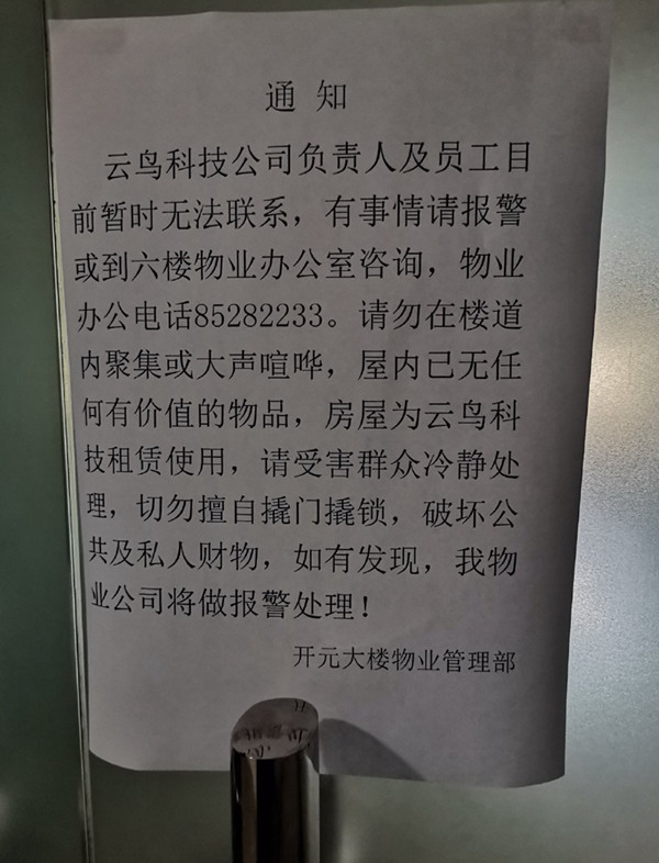我们是云鸟科技(北京驿路星辰科技有限公司)的员工。公司从事物流行业,收取司机押金及加盟费。结果这两天老板韩毅突然宣布公司清算,我们员工两千多人从8月份到现在的工资一分没发!工资金额达到数千万!司机押金也不退还!司机人数全国保守估计上万!!!司机押金及物流工资估计过亿!!!我们现在是维权无路!!!工资拿不到!司机押金不退还也找我们!