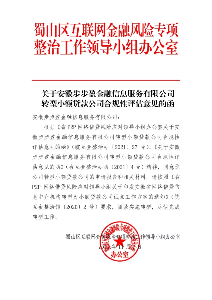 步步盈转型为(省内)小额贷款公司工作启动以来,在广大出借人客户们的理解和支持下,转型(省内)网络小额贷款公司申请已获得安徽省、合肥市和蜀山区P2P网络借贷风险应对领导小组审批通过。