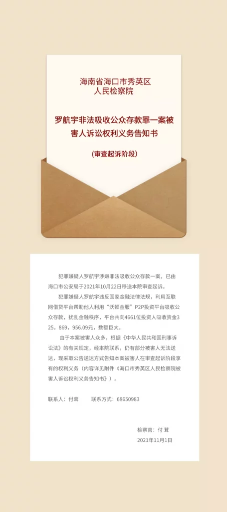 由于本案被害人众多,根据《中华人民共和国刑事诉讼法》的有关规定,经本院联系,仍有部分被害人无法送达,现采取公告送达方式告知本案被害人在审查起诉阶段享有的权利义务(内容详见附件《海口市秀英区人民检察院被害人诉讼权利义务告知书》)。