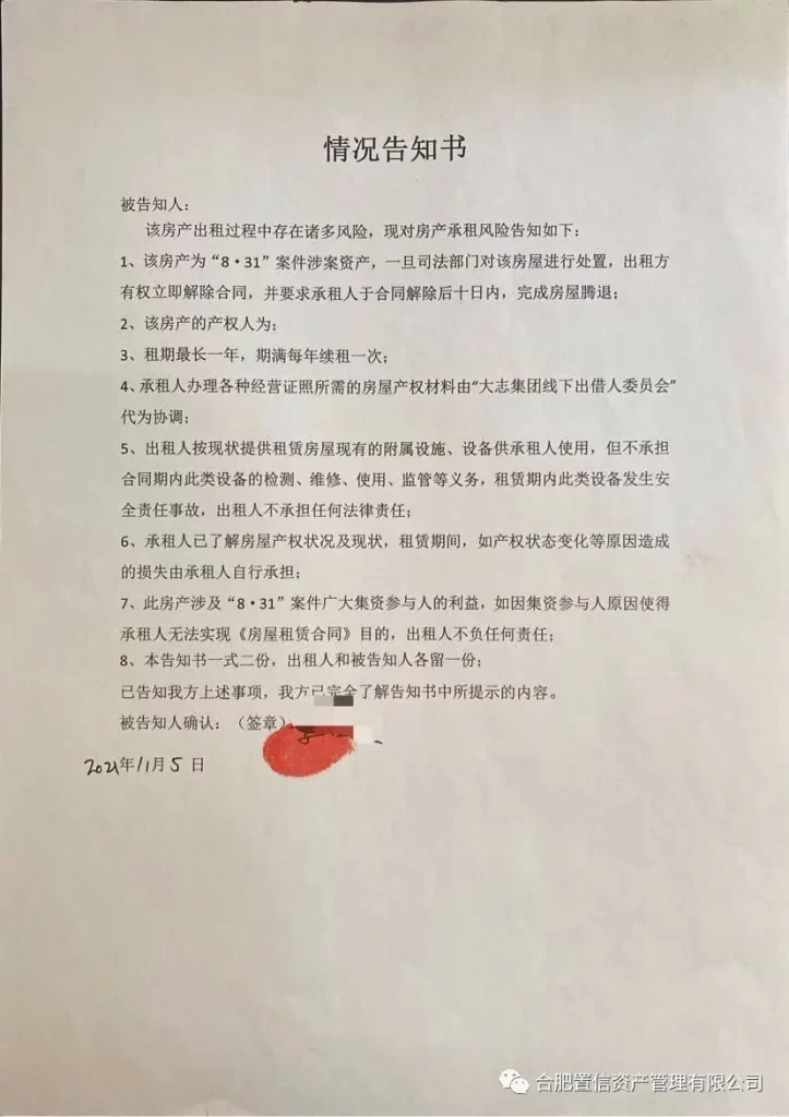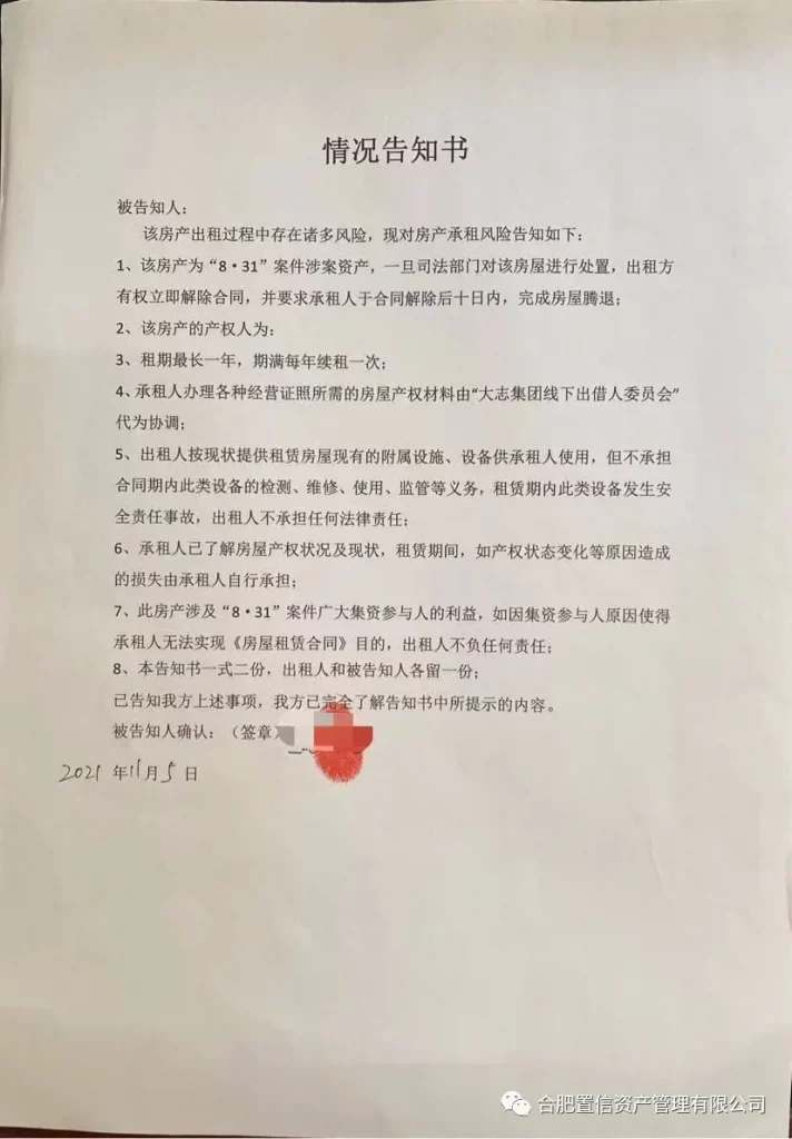 安捷财富(大志集团) 2021.11.12……大志部分涉案资产出租告知。鉴于大志涉案资产实际情况,经综合考虑后予以告知。
