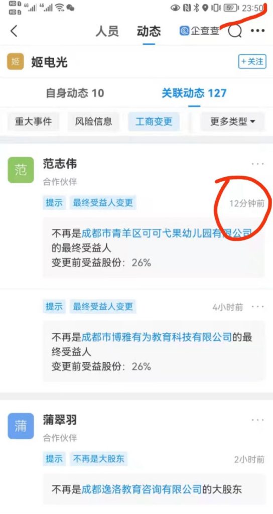 下午468的家长堵到468的法人了,守了一下午一晚上,联系上了范跑跑,说晚上十一点过飞机到成都过来商量。结果现在十二点半还没出现。几百个人等着他们,却突然发现他们悄悄变更了股权持股比例。这是要干嘛!!!!
