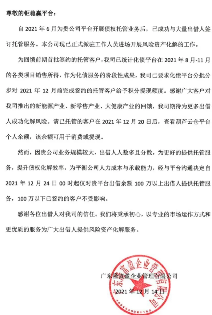 “钜稳赢”平台(深圳市海钜信达投资发展有限公司) 2021.12.15……风险处置机构广东隆富盈企业管理有限公司服务范围更新。经与平台沟通决定自2021年12月24日00时起仅对平台出借余额100万以上出借人提供托管服务,100万以下已签约的客户不受影响