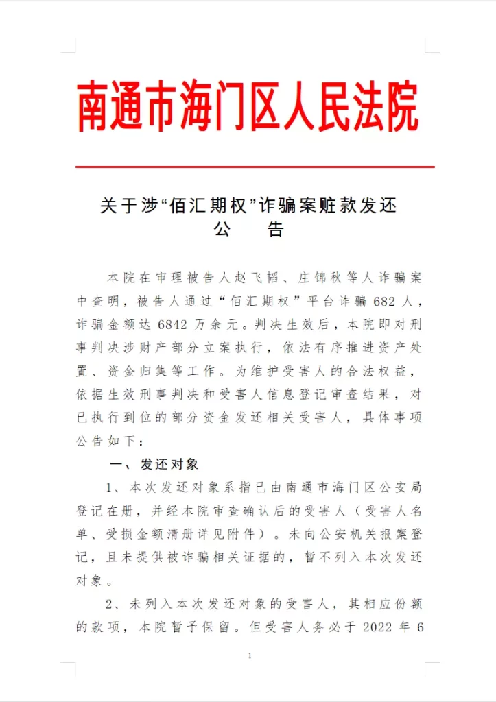 南通市海门区人民法院关于涉“佰汇期权”诈骗案赃款发还公告2022-01-21 来源:南通市海门区人民法院