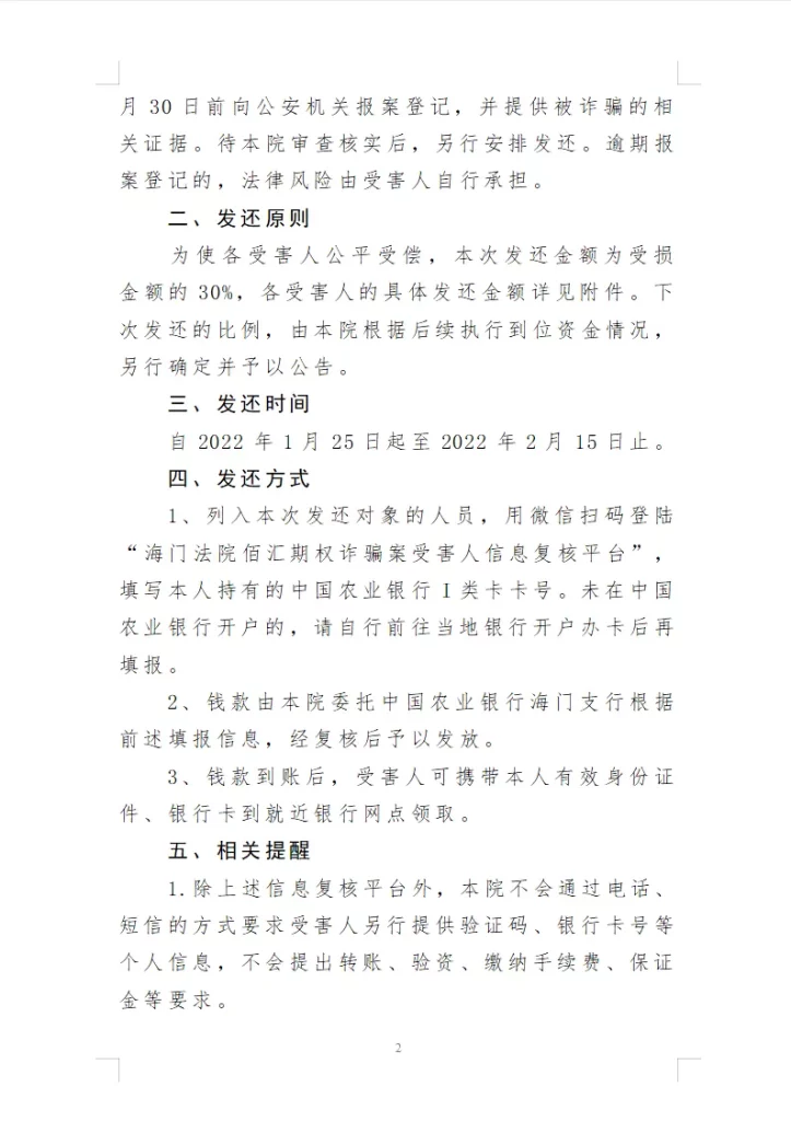 附件:海门法院关于涉“佰汇期权”诈骗案受害人信息复核小程序操作说明.pdf“佰汇期权”诈骗案赃款发还清单–2022.1.21.pdf