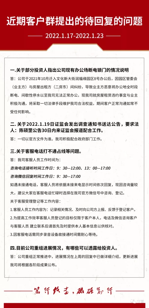 二.关于2022.1.19日证监会发出调查通知书送达公告,要求法人:陈硕罡公告30日内来证监会报道配合工作。