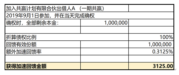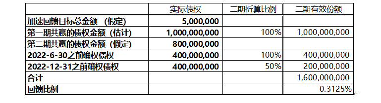 以下是二期回馈方案的模拟计算(所有数据只用于说明算法,数据不代表实际情况)