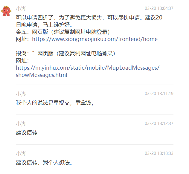 首先对于这个月菜钱的兑付,“小湖”始终没有正面答复,甚至回避这个话题,而是在各个群里发送了关于开放四折的消息。