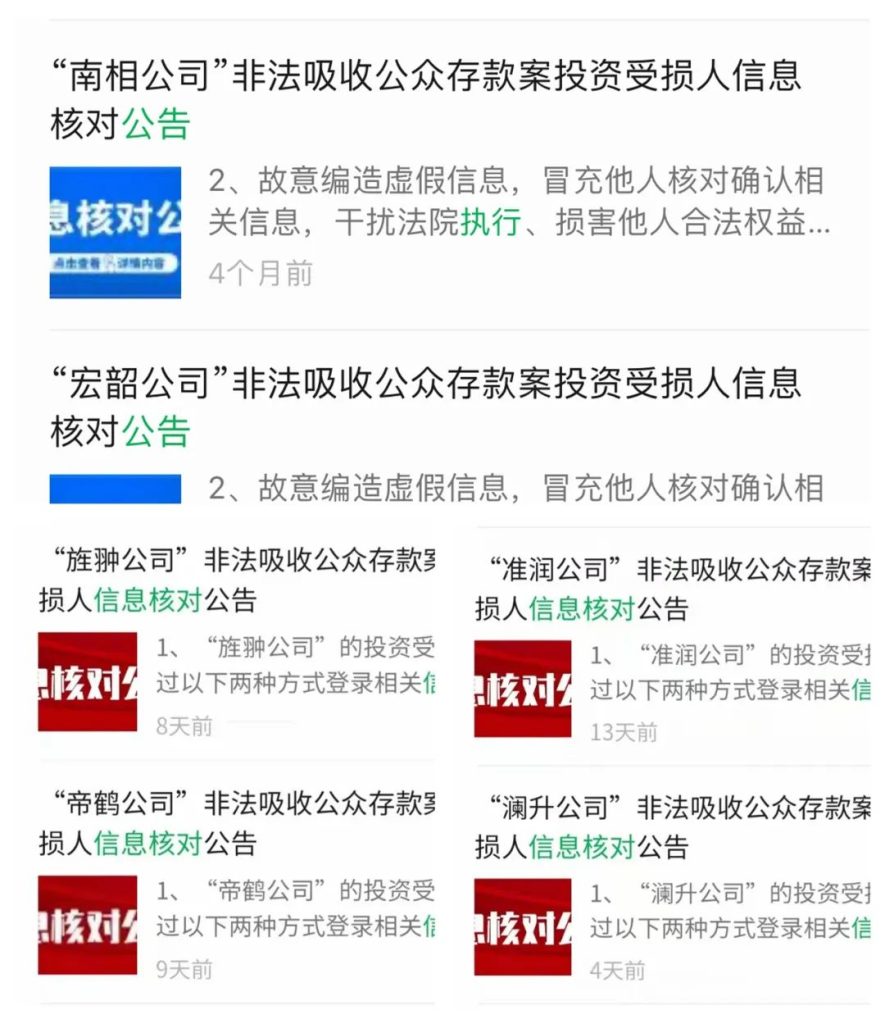 上海普陀法院非法集资案件财产执行工作简讯 2022.4.5……今年3月以来,上海普陀法院完成了“宏韶公司”和“南相公司”两个非法吸收公众存款案件的投资受损人员信息核对工作,现正进入案款发放阶段。同时,又先后完成了“准润公司”“帝鹤公司”“旌翀公司”“澜升公司”四个非法吸收公众存款案件的投资受损人员信息核对平台上线与公告发布工作,上述6个案件共计涉及投资受损人8515人,已执行到位金额近人民币5500万元