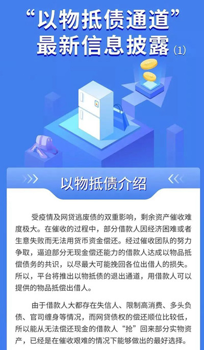 2022年3月底PP平台公告称:借款人无法偿还借款,逼迫无现金偿还能力的借款人达成以物品抵偿债务的共识,平台推出了以物抵债的退出通道,用借款人可以偿还的物品抵偿出借人。