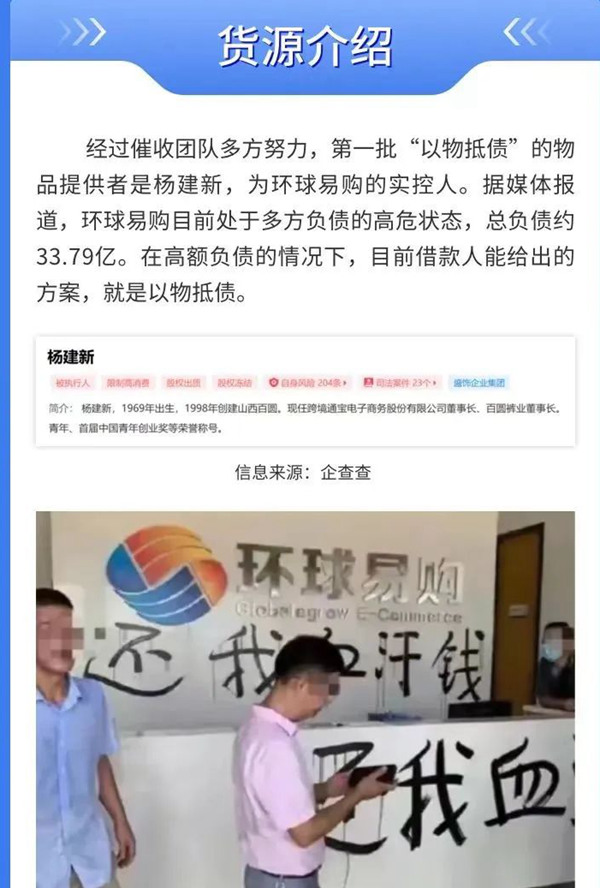 据PP官方报道第一批“以物抵债”的提供者是杨建新,为环球易购的实控人。据媒体报道,环球易购目前处于多方负债的高危状态,总负债约33.7亿