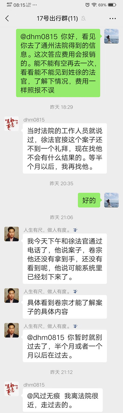 @dhm0815 你好,看见你去了通州法院得到的信息。这次答应费用会报销的。能不能有空再去一次,看看能不能见到姓徐的法官,了解下情况,费用一样照报不误